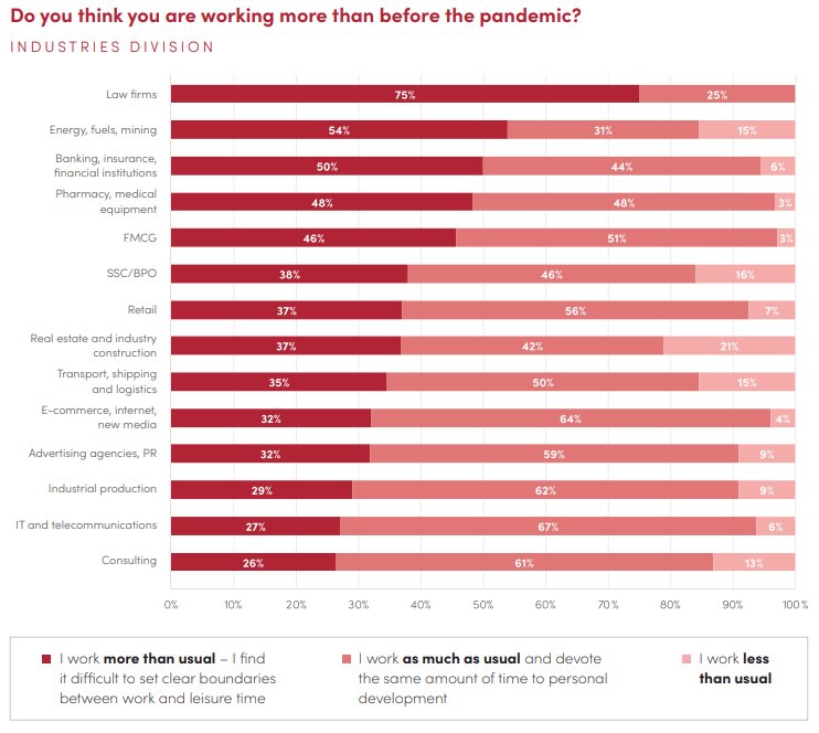 Více než 30 % specialistů a manažerů má pocit, že pracují více než před pandemií a mají problém určit hranici mezi prací a volným časem. Avšak více než polovina respondentů má pocit, že pracují stejně jako před pandemií a zároveň věnují stejné množství času osobnímu rozvoji. 67 % osob pracujících v oblasti IT a telekomunikací uvádí, že se výše jejich pracovní zátěže nezměnila. Naopak každý pátý respondent z oboru nemovitostí a stavebnictví uvádí, že v současné době pracuje méně než před pandemií.