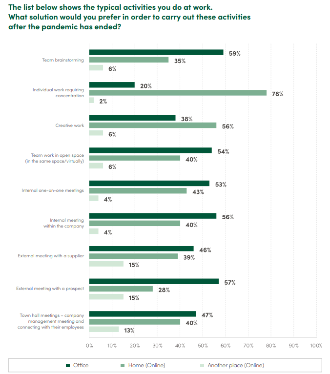 Pokud jde o meetingy, specialisté a manažeři dávají přednost kanceláři před domovem nebo jiným místem, odkud se mohou připojit online. Respondenti průzkumu upozorňují na potřebu zapojování se prostřednictvím osobních interakcí, zejména v případě týmového brainstormingu (59 %), externích schůzek s potenciálním klientem (57 %) a interních schůzek v rámci společnosti (56 %). Respondenti dávají přednost plnění svých povinností z domova pokud jde o individuální práci vyžadující soustředění (78 %) a kreativní práci (56 %).