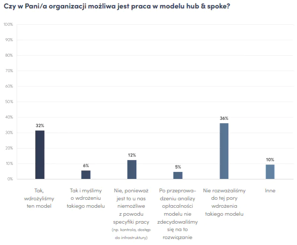 Według raportu Antal oraz Corees Polska „Model pracy a efektywność i zadowolenie pracowników” już co trzecia firma funkcjonuje w modelu hub & spoke. Sama idea nie jest nowa – ale zmiany w zarządzaniu wynikające z pandemii Covid-19 znacząco przyspieszyły wdrożenie jej w wielu organizacjach. Dodatkowo nie tylko wpływa na obniżenie kosztów operacyjnych firm, ale także silnie stymuluje rozwój miast regionalnych, napędzając lokalną gospodarkę oraz rynek pracy.