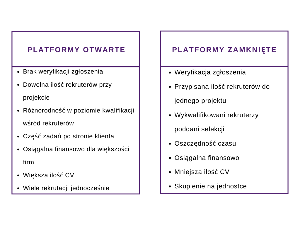 Rekruter – platformy otwarte nie prowadzą weryfikacji rekruterów. Każdy, kto czuje, że ma potencjał, chęci czy ambicje, może zacząć tam swoja przygodę z rekrutacją i uczyć się fachu metodą prób i błędów.
