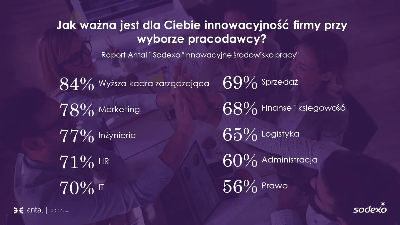 Innowacyjność, przy wyborze miejsca pracy najbardziej ceni wyższa kadra zarządzająca (84%). Jest kluczowa także dla 77% inżynierów i osób pracujących w marketingu. Na innowacyjność najmniej zwracają uwagę prawnicy (56%) i administracja (60%).