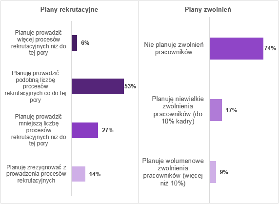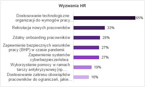 Najwięcej respondentów (65%) wskazuje, że wyzwaniem dla ich działalności jest dostosowanie technologii organizacji do wymogów pracy zdalnej. Kolejnym wyzwaniem jest rekrutacja nowych pracowników, a co za tym idzie zdalny onboarding. Również bardzo ważne jest zapewnienie bezpiecznych warunków pracy w czasie pandemii.
