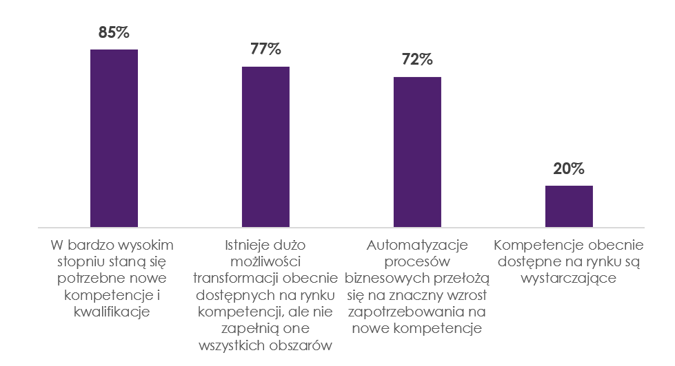 Badani są zgodni (85%), że w związku z rozwojem sztucznej inteligencji i uczenia maszynowego w bardzo wysokim stopniu staną się potrzebne nowe kompetencje i kwalifikacje, a automatyzacje procesów biznesowych przełożą się na znaczny wzrost zapotrzebowania na nowe umiejętności (72%).