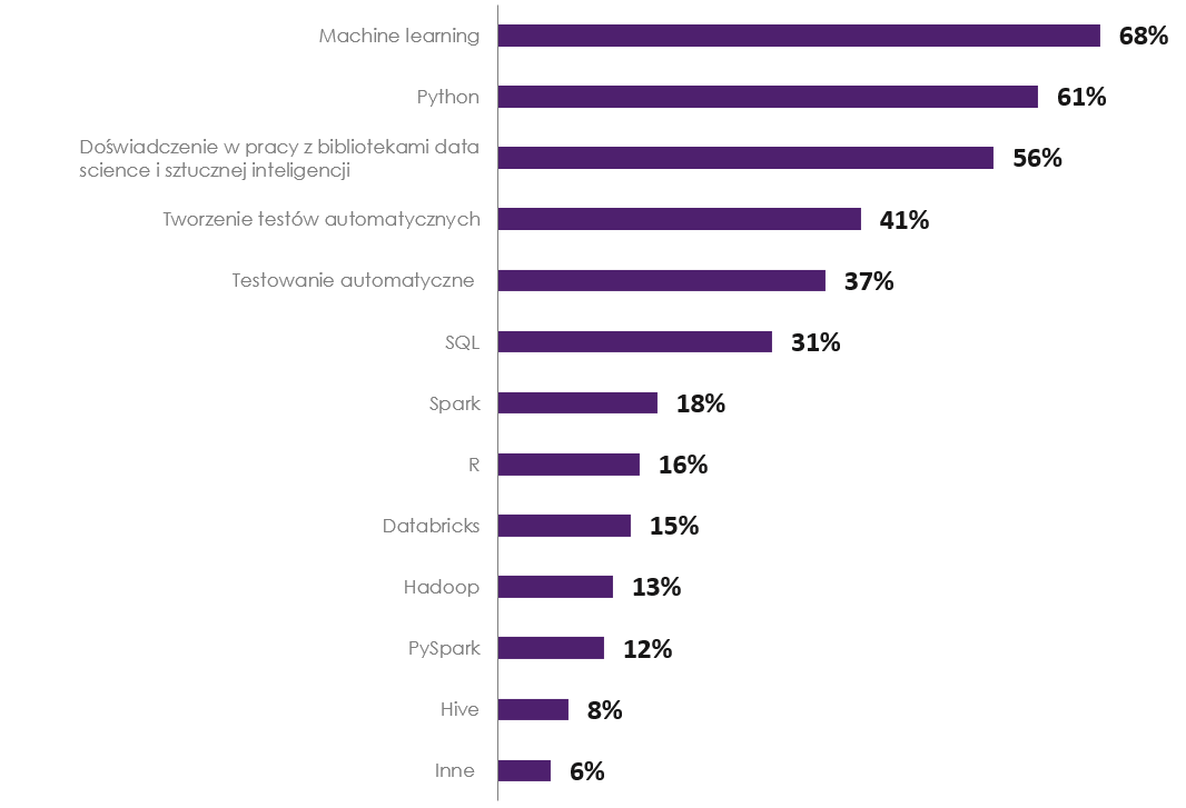 W związku z wdrażaniem rozwiązań wykorzystujących sztuczną inteligencję i uczenie maszynowe w tworzeniu, testowaniu, wdrażaniu i stosowaniu oprogramowania wśród kandydatów pożądane jest co najmniej kilkuletnie doświadczenie komercyjne, umiejętność rozwiązywania problemów i pracy w zespole, samodzielność i dobra znajomość wymaganej przez pracodawcę technologii. Pracodawcy najczęściej szukają osób z poziomu regular, senior i lead, czyli przynajmniej ze średnio zaawansowaną wiedzą w branży IT. Do najbardziej pożądanych kompetencji będą należeć: