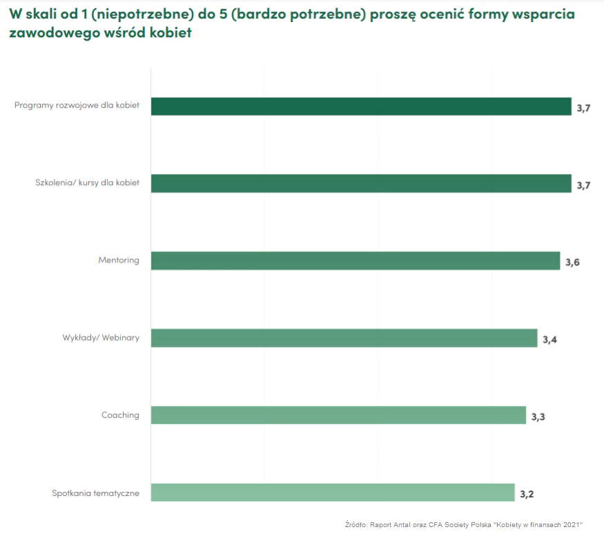 W przypadku oceny potrzebnych form wsparcia brakuje wyraźnych preferencji. Najbardziej niezbędne wydają się programy rozwojowe oraz szkolenia i kursy dla kobiet ze średnim wynikiem 3,7 w pięciostopniowej skali. Kolejne działania to mentoring (3,6) oraz wykłady/ webinary (3,4). Na końcu znalazł się coaching (3,3) oraz spotkania tematyczne (3,2). Warto zauważyć, że w poprzedniej edycji (2019) były one wskazywane jako najbardziej niezbędne.
