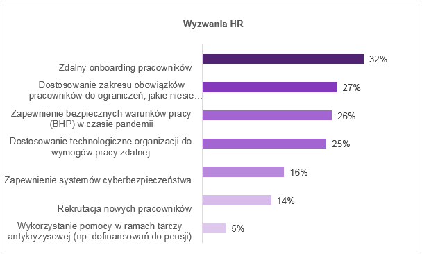 Rozwijająca się pandemia COVID – 19 ma ogromny wpływ na całą gospodarkę i stanowi wyzwanie dla wielu przedsiębiorstw. Najwięcej respondentów reprezentujących branżę IT (32%) wskazuje, że kluczowym aspektem HR dla ich działalności jest obecnie zdalny onboarding pracowników oraz dostosowanie zakresu obowiązków pracowników do wymogów, jakie niesie za sobą praca zdalna. Zapewnienie bezpiecznych warunków pracy w czasie pandemii staje się kolejnym zadaniem dla HR.