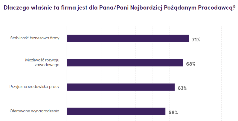 Oferowanie benefitów pozapłacowych to obecnie standard – jak pokazują odpowiedzi pracowników, 9 na 10 pracodawców w pełni lub częściowo finansuje prywatną opiekę medyczną, kartę fitness i kursy edukacyjne dla pracowników. Te elementy to zatem swego rodzaju „must have” organizacji – aż 41% respondentów wskazuje benefity pozapłacowe jako główne uzasadnienie przyznania lauru najbardziej pożądanego pracodawcy.