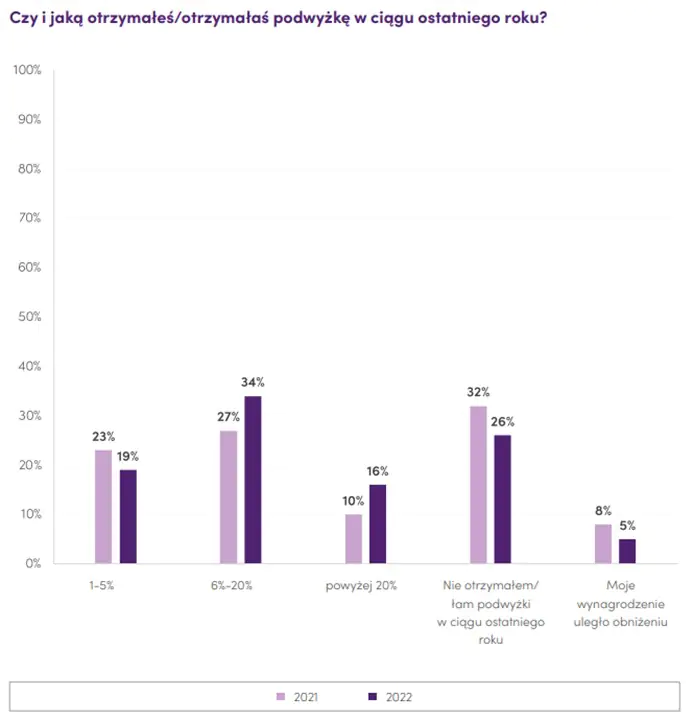 Niemal 70% badanych otrzymało podwyżki co oznacza wzrost do ubiegłego roku o 10 punktów procentowych. Rośnie też udział tych wysokich wzrostów pensji - powyżej 20% rok do roku. Rynek kandydata kwitnie i pracownicy z tego korzystają. Inflacja daje im dodatkowe argumenty w negocjacjach.