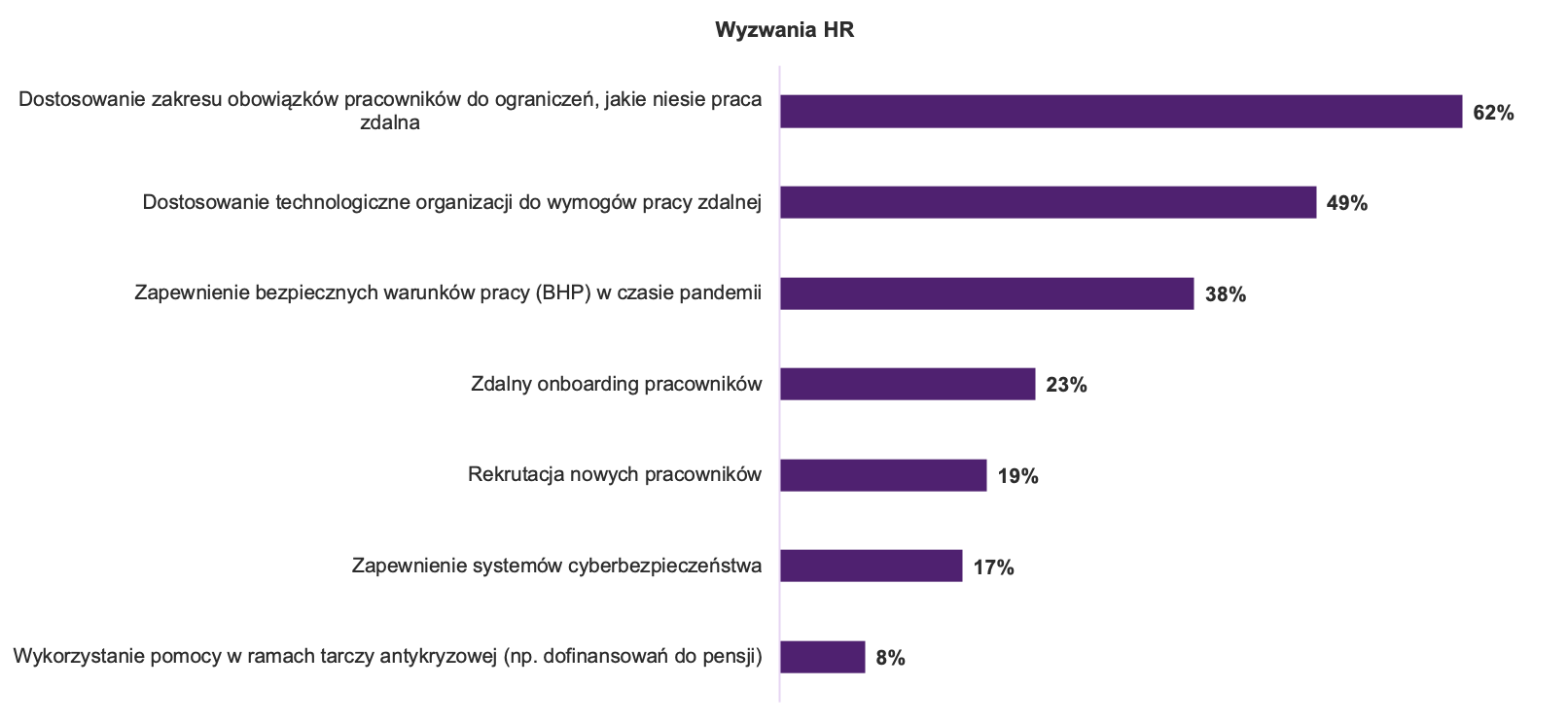Najwięcej respondentów (62%) wskazuje, że wyzwaniem dla ich działalności jest dostosowanie zakresu obowiązków pracowników do wymogów jakie niesie za sobą praca zdalna. Również dostosowanie technologiczne w tym aspekcie jest ważne dla niemal połowy organizacji.