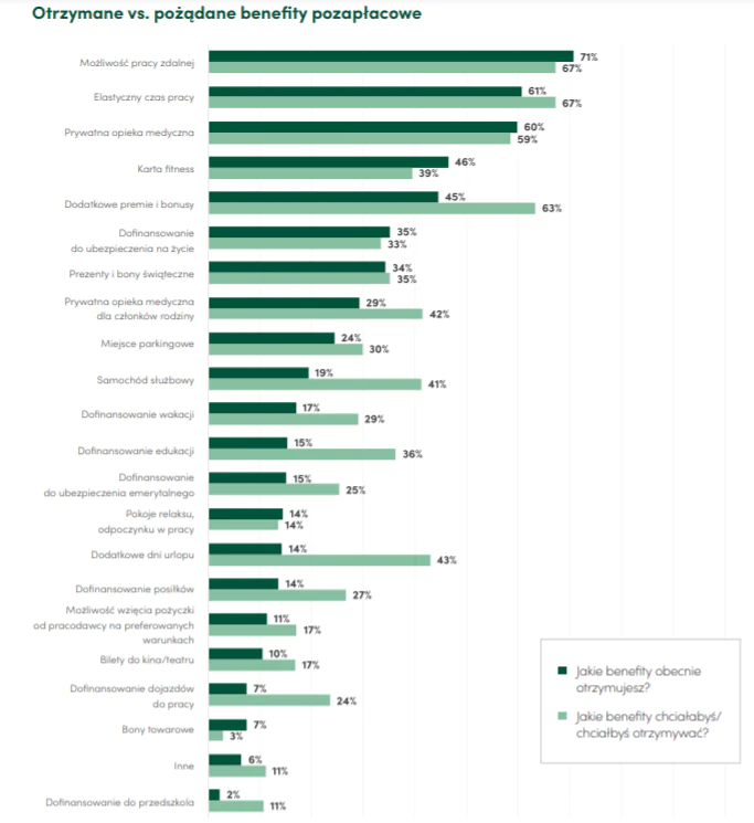 Nie zaskakuje fakt, że rok pandemii przyniósł zdecydowany wzrost możliwości pracy zdalnej (o 20 punktów procentowych). Nieznacznie zwiększyły się również możliwości elastycznego czasu pracy oraz dni dodatkowego płatnego urlopu (wzrost o 3 punkty procentowe). Najwięcej respondentów straciło dostęp do karty fitness (spadek o 5 punktów procentowych), a także samochód służbowy oraz dofinansowanie do posiłków czy wakacji (spadek o 4 punkty procentowe). Ograniczenia dotyczą więc obszarów lub usług dotkniętych ograniczeniami związanymi z pandemią lub wynikają z rzadszej obecności pracowników w biurach.